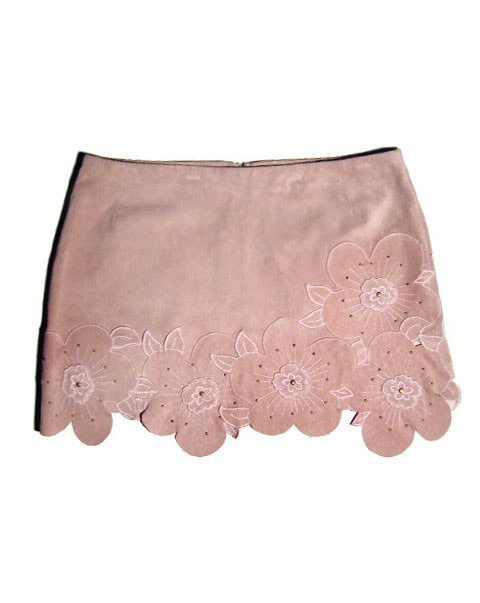 Laser cut lacquered silk layered over habotai waist detail with buttons on an inverted pleat suede mini skirt